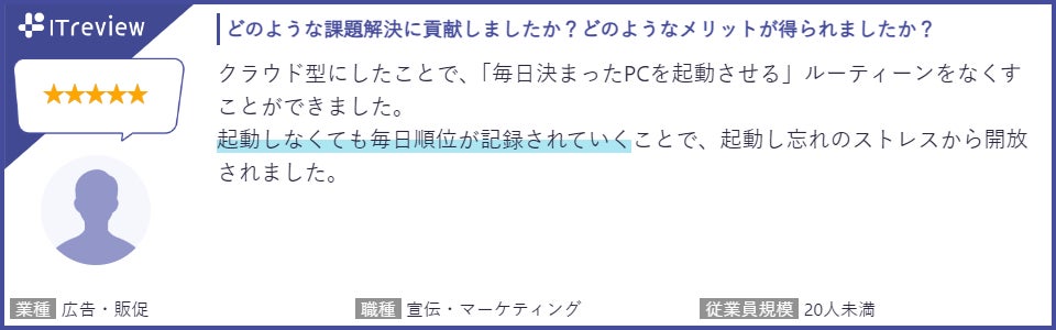 本製品は、ITreview(https://www.itreview.jp/ )でのユーザーレビュー数が120件を突破し、満足度4.3(5段階評価)という高い評価を得ています。(2024年10月20日時点)