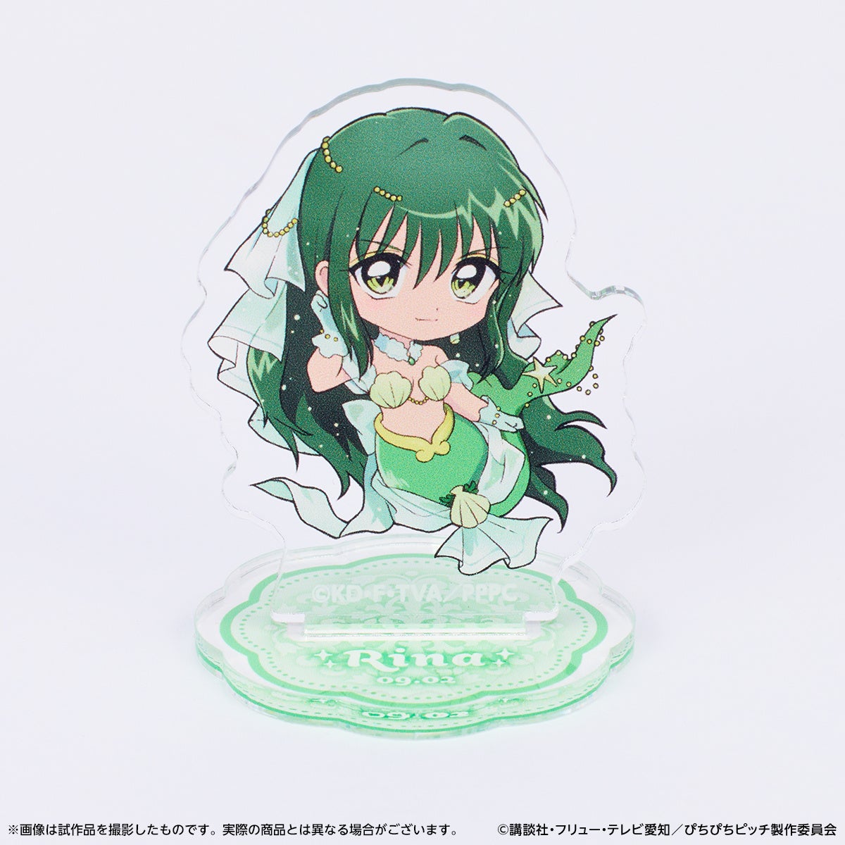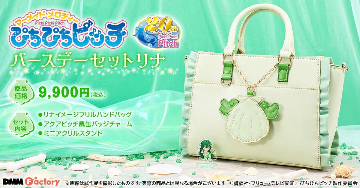 放送20周年を迎えたテレビアニメ『ぴちぴちピッチ』のマーメイドプリンセスたちを祝うバースデーセット第4弾は、「リナ」をイメージしたフリルハンドバッグ、アクアピッチをイメージした缶バッジチャーム、ミニキャライラストを使用したアクリルスタンドのセット。