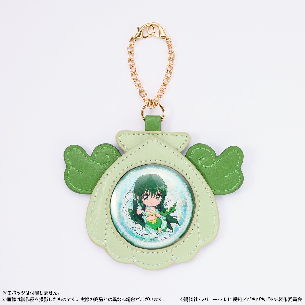 リナのアクアピッチをイメージしたグリーンの缶バッジチャームは裏面にビニール加工が施されています。