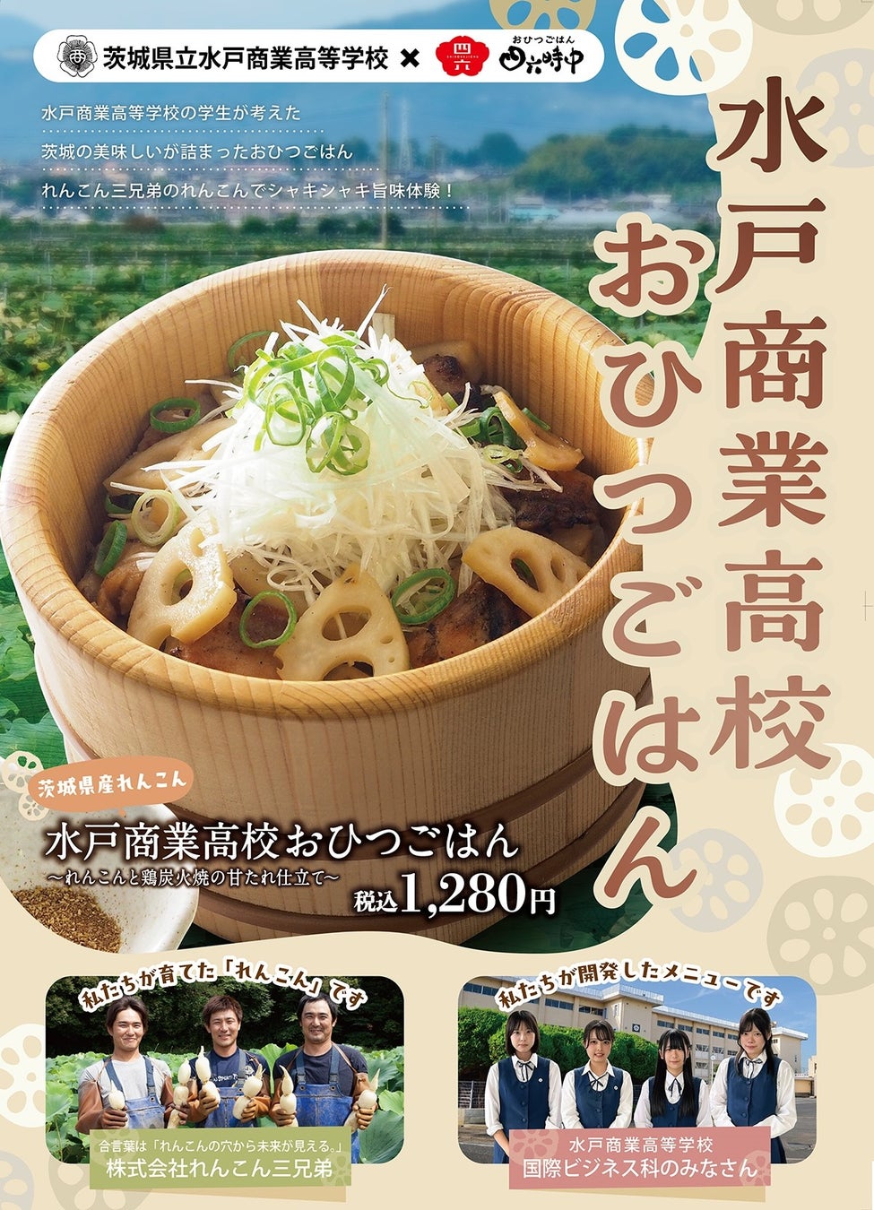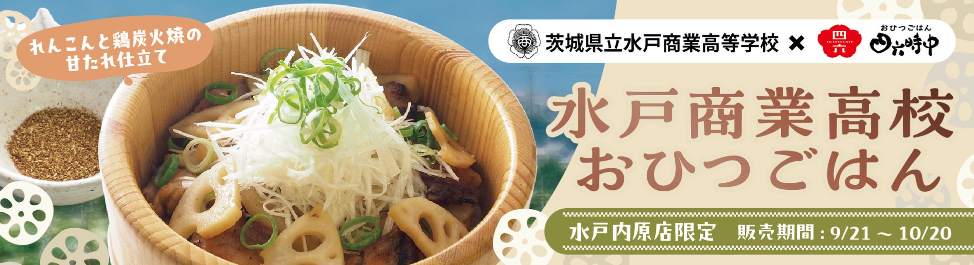 当社は、地域の方に愛され、地域に根差した食文化を楽しんで頂ける店舗を目指し、ご当地グルメやその地域特有の素材を取り入れた四六時中ならではのメニュー開発を強化しております。こうした取り組みの一環として、この度、水戸商業高校国際ビジネス科の商品開発学習にて考案されたメニューを『おひつごはん 四六時中』水戸内原店限定にて、9月21日(土)~10月20日(日)まで販売いたします。