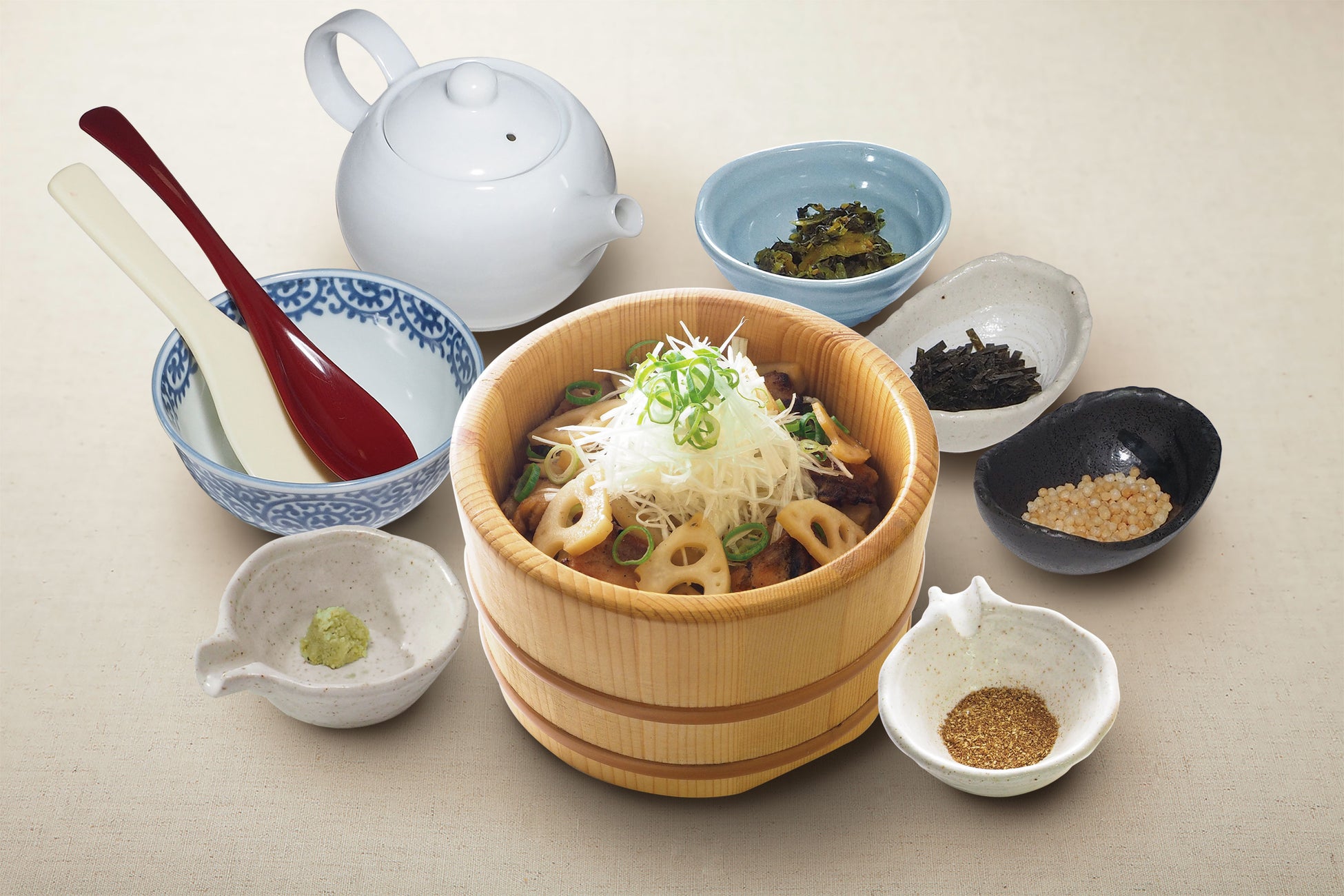 今回考案されたメニューは、地元茨城県で手堀り収穫されたれんこん(生産者:(株)れんこん三兄弟)を使用し、この時期のれんこんの特徴であるシャキシャキ食感を楽しめる仕立てとなっております。こだわりのれんこんと甘たれに絡めた炭火焼の鶏肉が絶妙にマッチした一品となっており、また『おひつごはん 四六時中』の“特製だし”とも調和する味付けとなっているので、締めはだし茶漬けとしてもお愉しみいただけます。