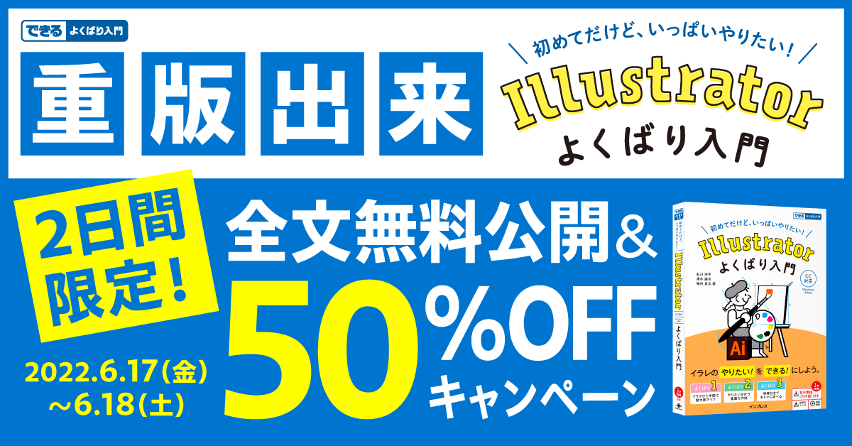 このたび、『Illustratorよくばり入門(できるよくばり入門)』の重版が決定したことを記念して、6月17日(金)と6月18日(土)の2日間限定で「重版記念キャンペーン」を実施いたします。キャンペーン期間中は、本書の全ページをネット上で試し読みできる「全文無料公開」を実施し、同時に、当社直販サイト「インプレスブックス」で本書の電子書籍版を50%OFF(半額)で販売します。