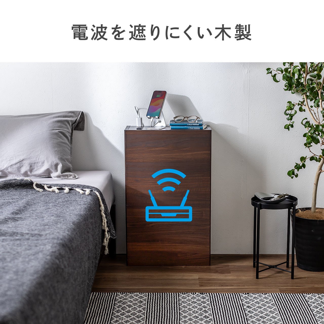 本体はすべて木製なので無線ルーターなどのWi-Fi機器を収納しても電波障害が少なく、快適にお使いいただけます。