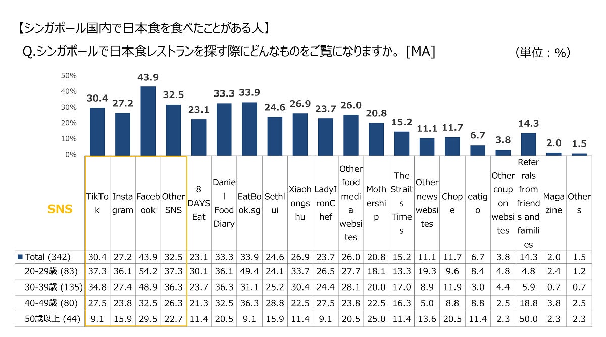 日本食レストランを探す際の情報源については、全体ではFacebook(43.9%)が最も利用されており、特に20-39歳の若い世代で利用されています。SNSの中ではInstagram(27.2%)やTikTok(30.4%)よりも割合が高く、有力な情報源となっていることが分かりました。SNS以外では20-29歳と40-49歳でシンガポール国内外のグルメ・フード情報を発信する現地オンラインメディアEatBook.sg、30-39歳ではシンガポールの人気グルメブログDanielFoodDiaryが厚い支持を得ています。
