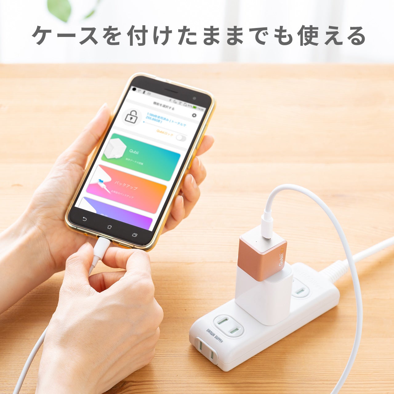 ACアダプタ、本製品、スマートフォンをケーブルで接続し、専用アプリ「Qubii Pro」を使用することで、接続するたびに自動でデータをバックアップできます。