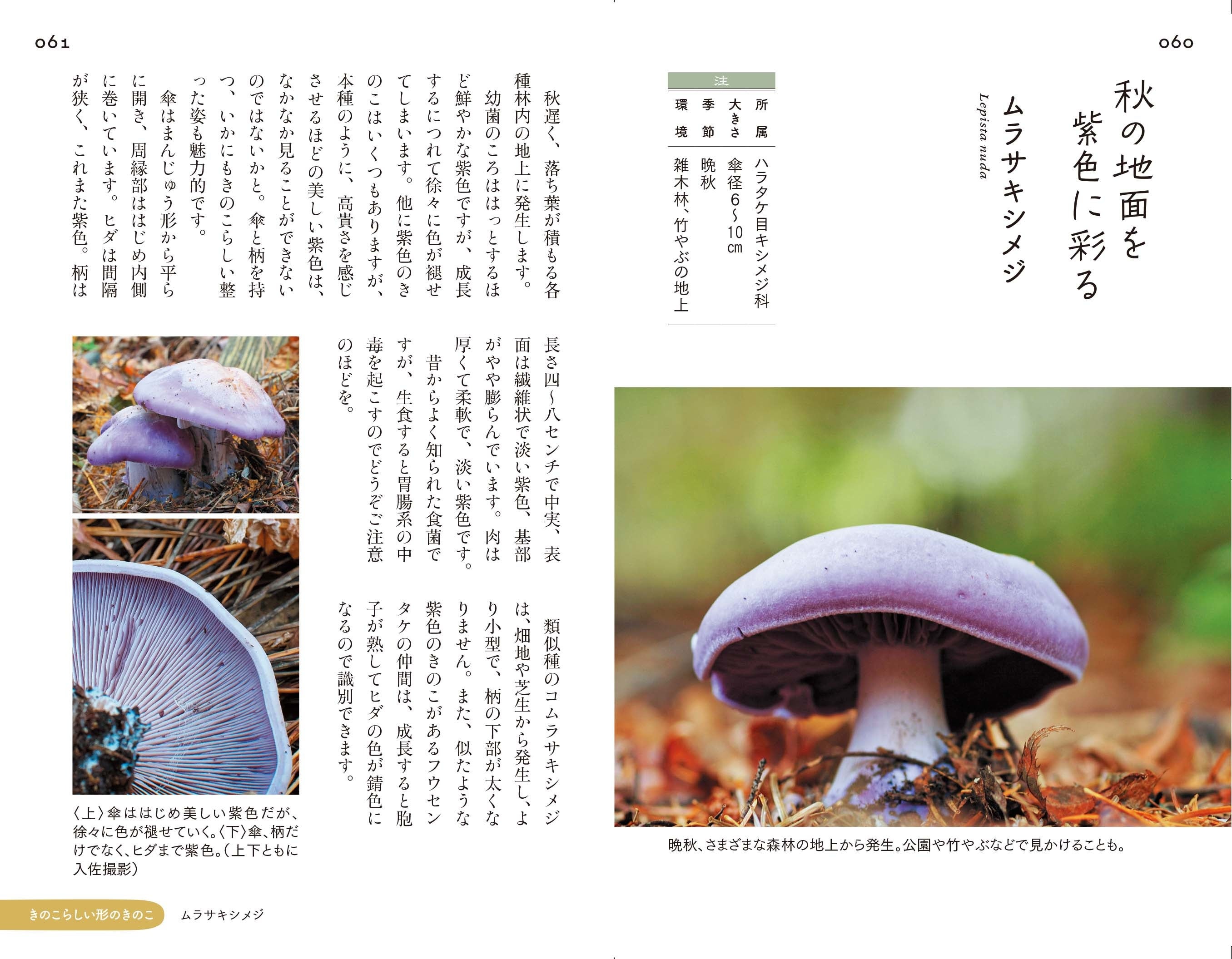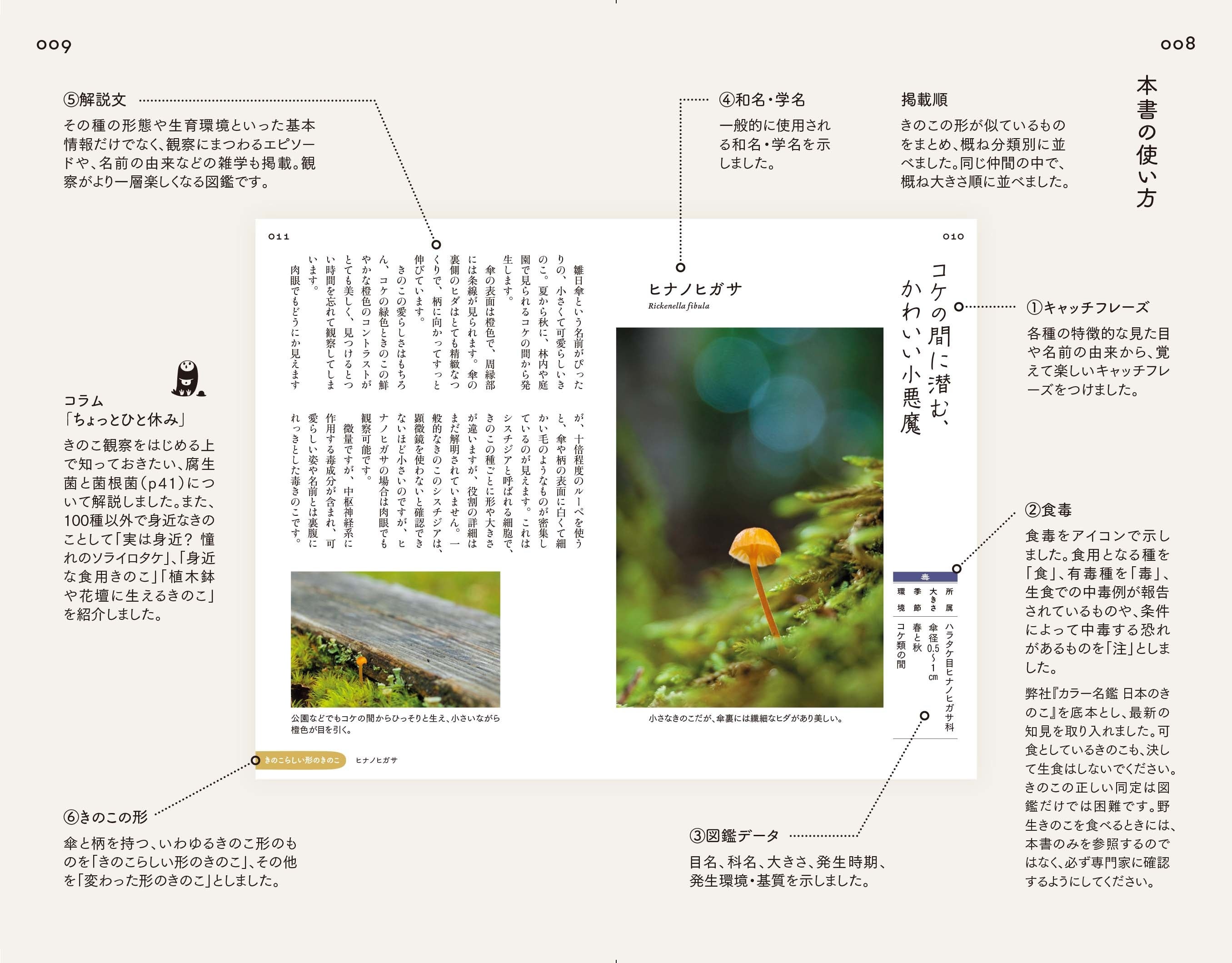解説文には図鑑としての基本情報はもちろん、食毒や見分けのポイント、知ると面白い生態、名前の由来などの雑学も掲載。これまできのこ観察を楽しんできた人も、より一層観察が楽しくなる図鑑です。