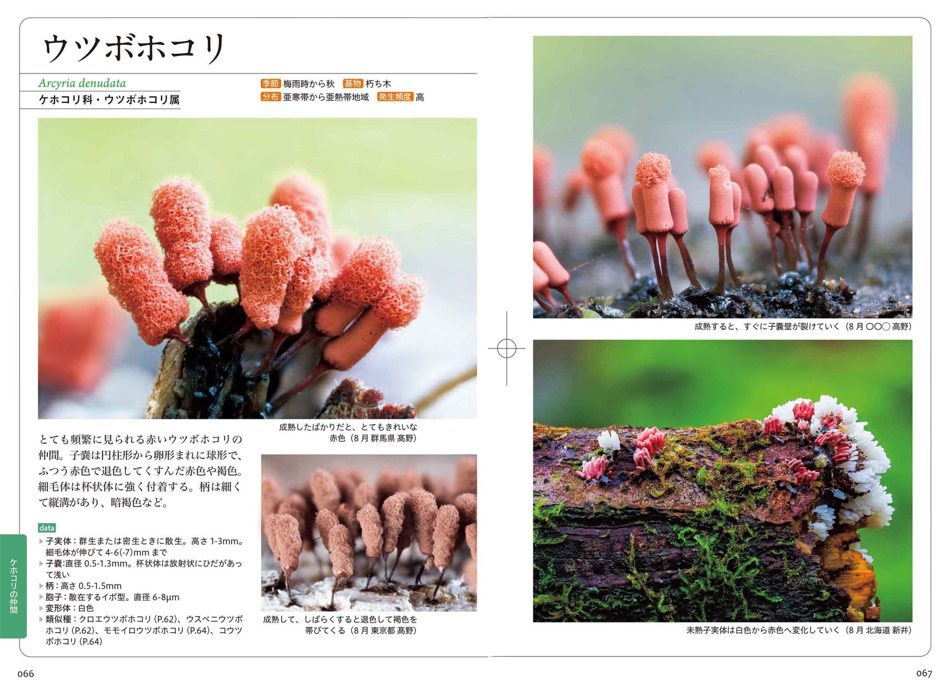 そのほか、各種の特徴がわかりやすい写真や、発生環境がよくわかる美しい生態写真を多数掲載。色鮮やかで多様な形の変形菌写真が満載なので、写真集のように眺めるだけでも変形菌の世界を楽しめるでしょう。