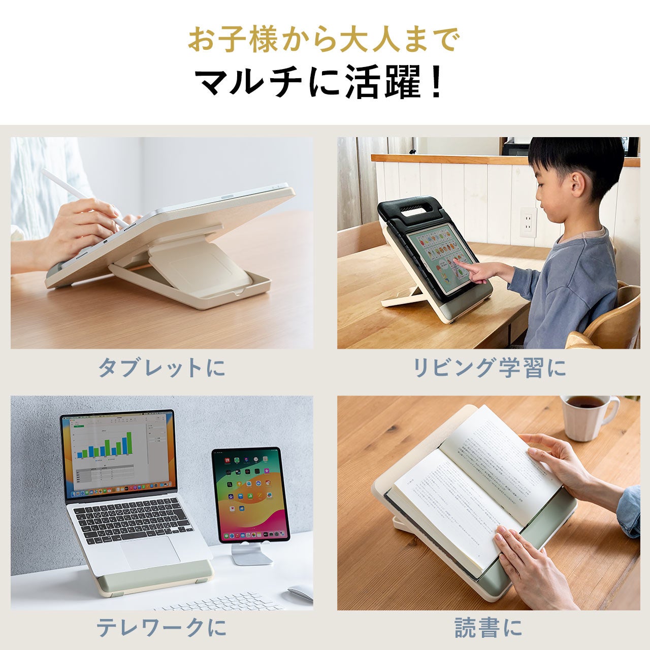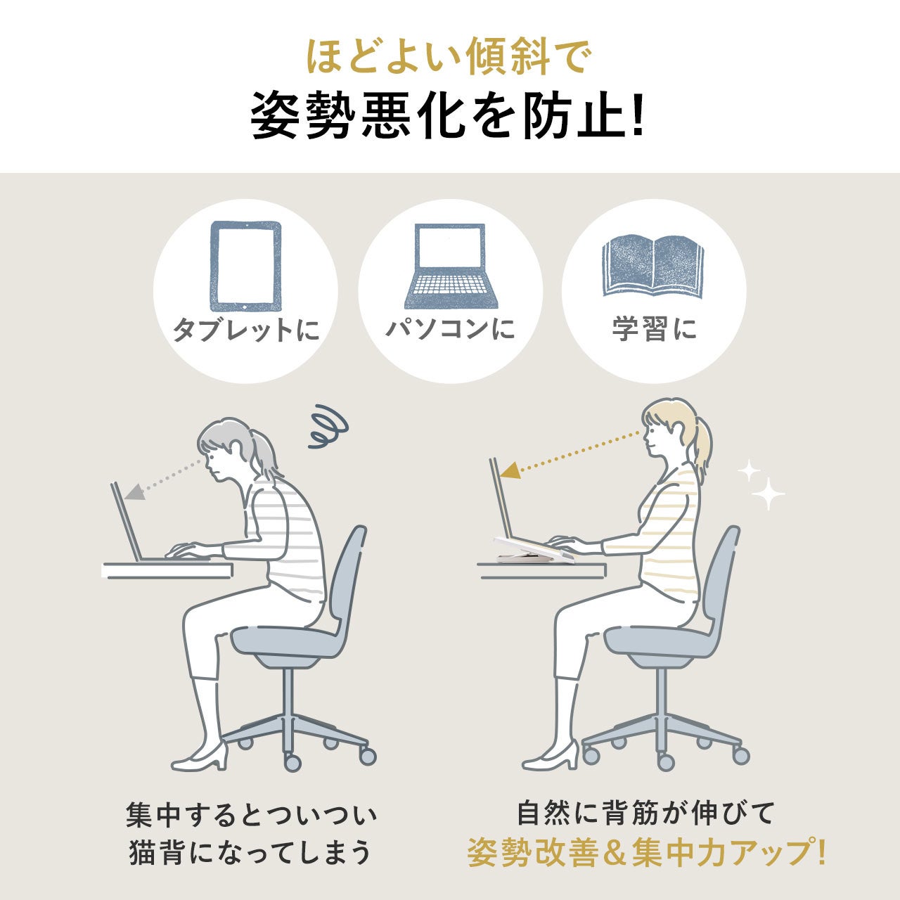 学習机やダイニングテーブル、リビングテーブルなどに置いて使うことで学習時の姿勢を改善し、体への負担の軽減と学習環境を整えます。