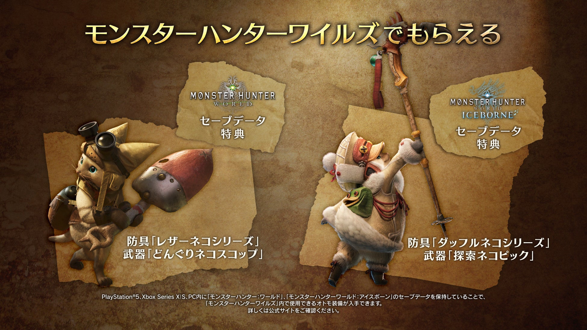 『モンスターハンター:ワールド』、『モンスターハンターワールド:アイスボーン』のセーブデータがあると、シリーズでおなじみのオトモアイルー装備と「ハンタープロフィール」で利用できる「ネームプレート」を受取可能。