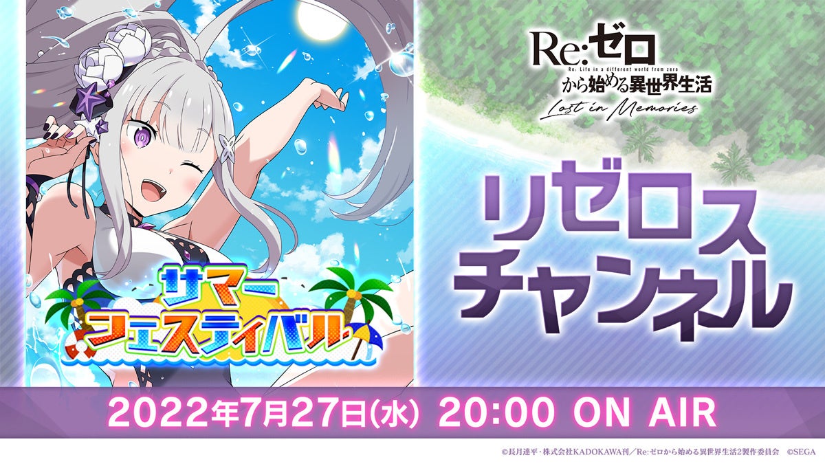 株式会社セガは、人気テレビアニメ「Re:ゼロから始める異世界生活」公式スマートフォン向けゲーム『Re:ゼロから始める異世界生活 Lost in Memories(以下、『リゼロス』)』にて、7月27日(水)20:00より、『リゼロス』公式放送「リゼロスチャンネル」第15回の配信が決定したことをお知らせします。