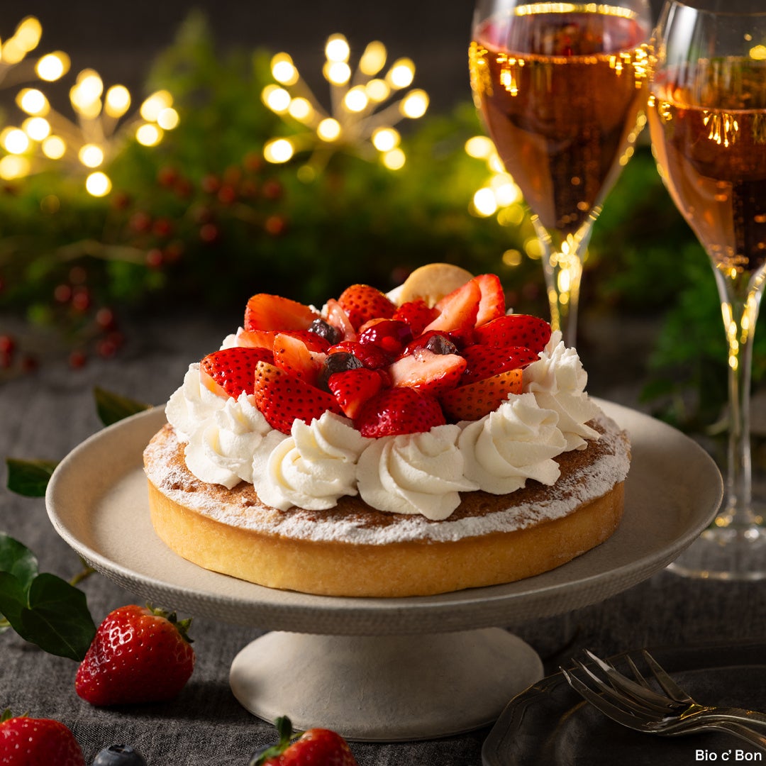 米粉スイーツとパンの専門店が作るグルテンフリーのクリスマスケーキ。国産米粉を使用したタルト生地の上には、有機のいちご、ラズベリー、ブルーベリーが彩られています。