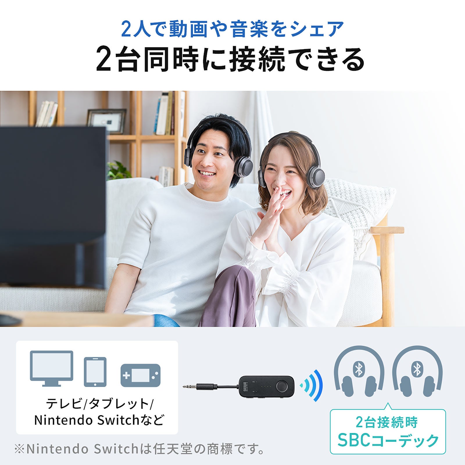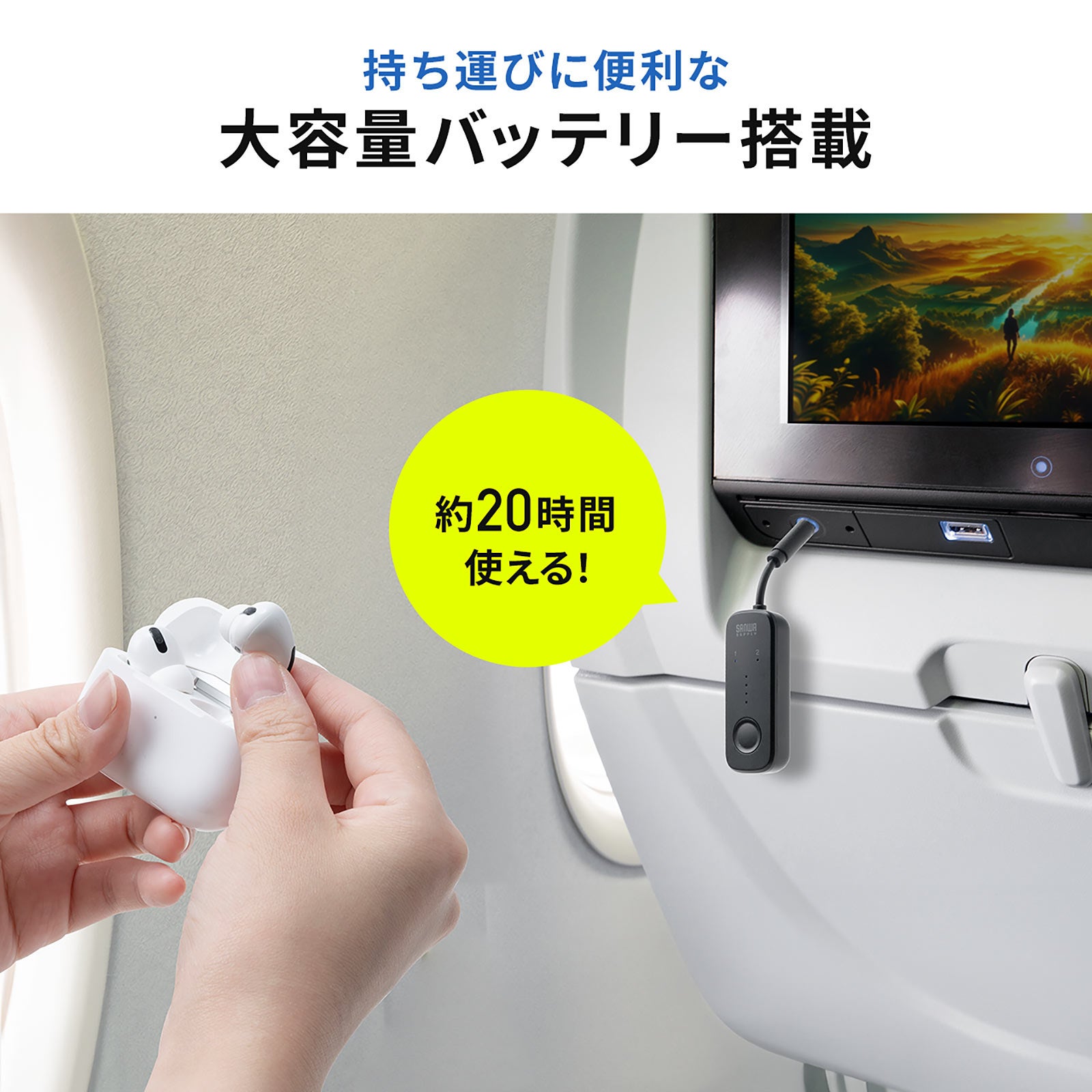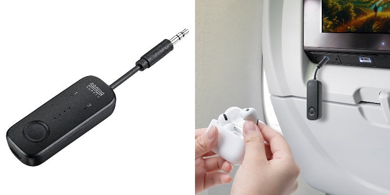本製品は、飛行機内エンタメやテレビの音声をワイヤレス送信できるBluetoothトランスミッターです。