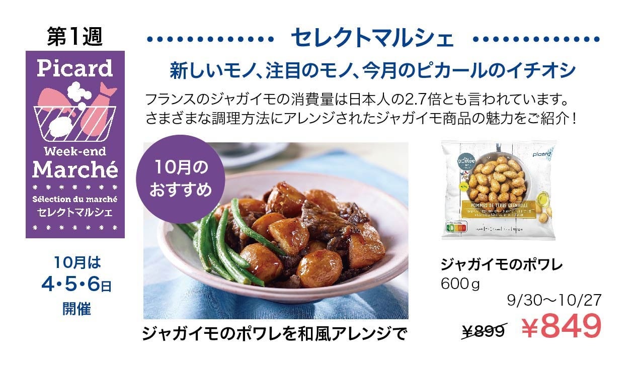 ピカールでは、マルシェ(市場)に買い物に行ったときのワクワク感、選んで、使って、味わえる楽しさを体験できるような新しい企画「ピカールウィークエンドマルシェ」を10月4日(金)から毎月4回、第1週から第4週の週末(金曜日、土曜日、日曜日)に開催します。