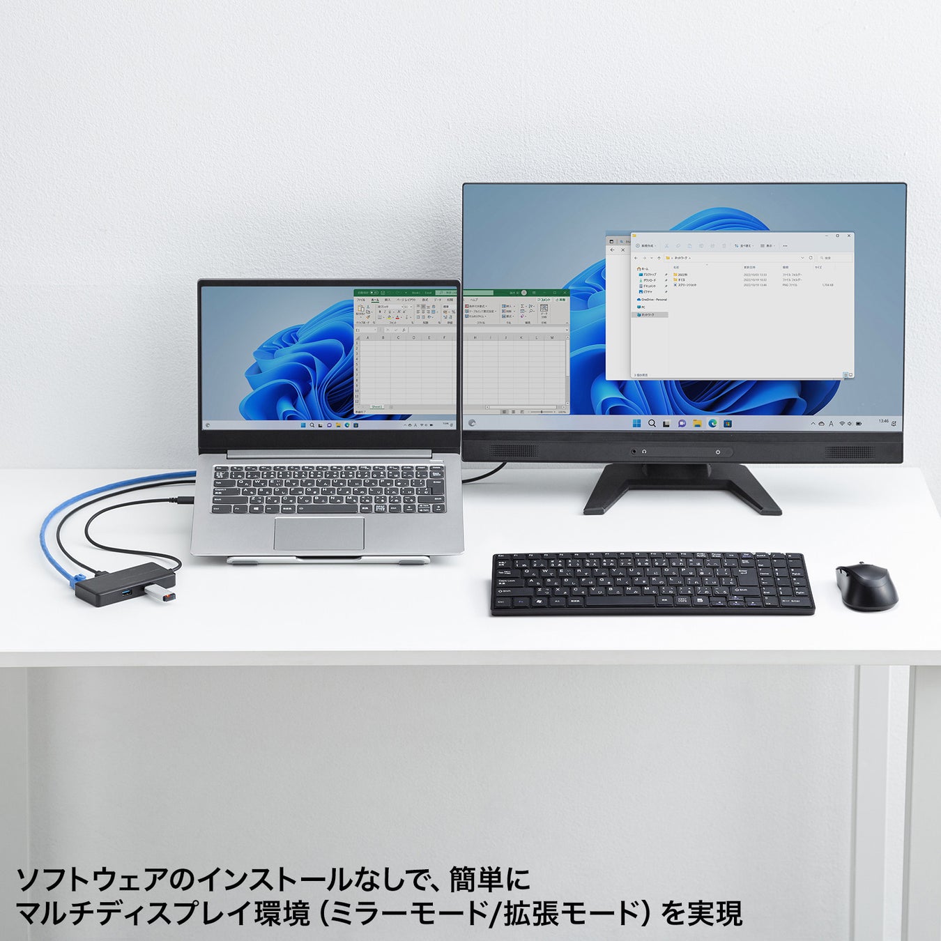 通信速度5GbpsのUSB3.2 Gen1規格対応のUSBポートを2つ搭載し、サイズの大きなデータもスムーズに移動できます。USB Type-Cでの「USB Power Delivery(USB PD)」対応で、接続したパソコンへの給電も本製品経由で可能です。LANポートは、Gigabit Ethernetに対応しているのでGigabitネットワーク環境にも対応し、Type-Cケーブル1本で有線LAN接続できます。 HDMI出力は、USB Type-C接続でのHDMIディスプレイ増設「DisplayPort Alt Mode」に対応するため、ソフトウェアのインストールなしで、簡単にマルチディスプレイ環境(ミラーモード/拡張モード)を構築できます。最大4K/30Hzでの画面出力が可能で、大画面に高精細の映像を出力できます。
