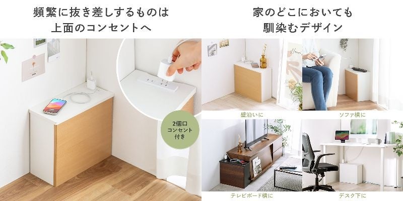 天板には2口のコンセント付きです。本体はすべて木製なので無線ルーターなどのWi-Fi機器を収納しても電波障害が少なく、快適にお使いいただけます。