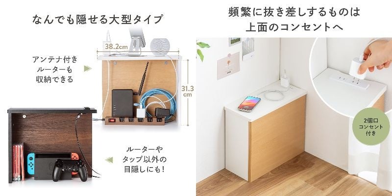 本製品は、ケーブルや電源タップ、Wi-Fiルーターなどが綺麗に収納できる木製の収納ボックスです。コーナーに機器をまとめて簡単に設置できる簡易型収納です。背面がフルオープンなので、かぶせるだけで設置ができます。