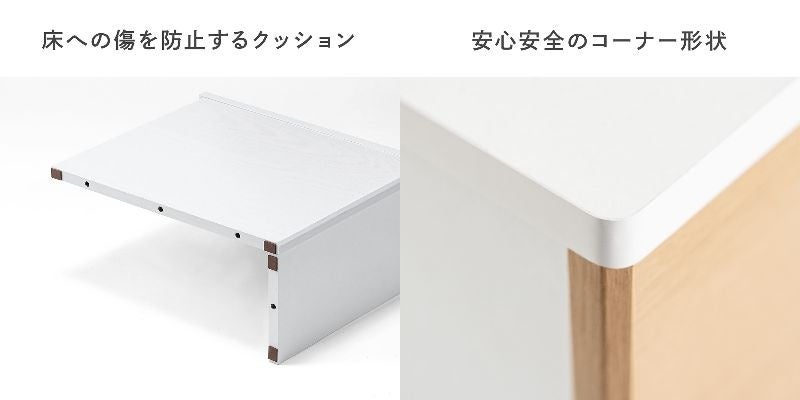 出っ張っている天板前側の角は面取りしており、底面には傷つき防止のクッション付きです。