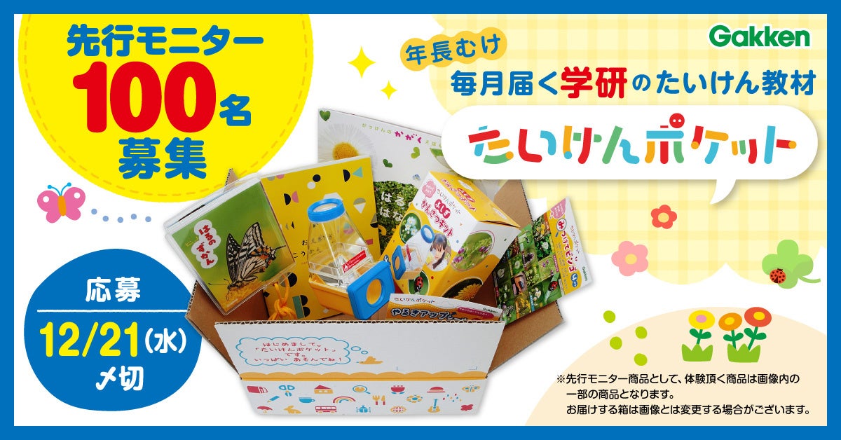 株式会社 学研ホールディングス(東京・品川/代表取締役社長:宮原博昭)のグループ会社、株式会社 Gakken(東京・品川/代表取締役社長:五郎丸 徹)が運営する5・6歳(年長)むけのサービス『たいけんポケット』は、2023年度版のサービス開始にあわせ、2022年12月16日(金)より先行モニターを100名募集いたします。先行モニターの募集締め切りは12月21日(水)となります。
