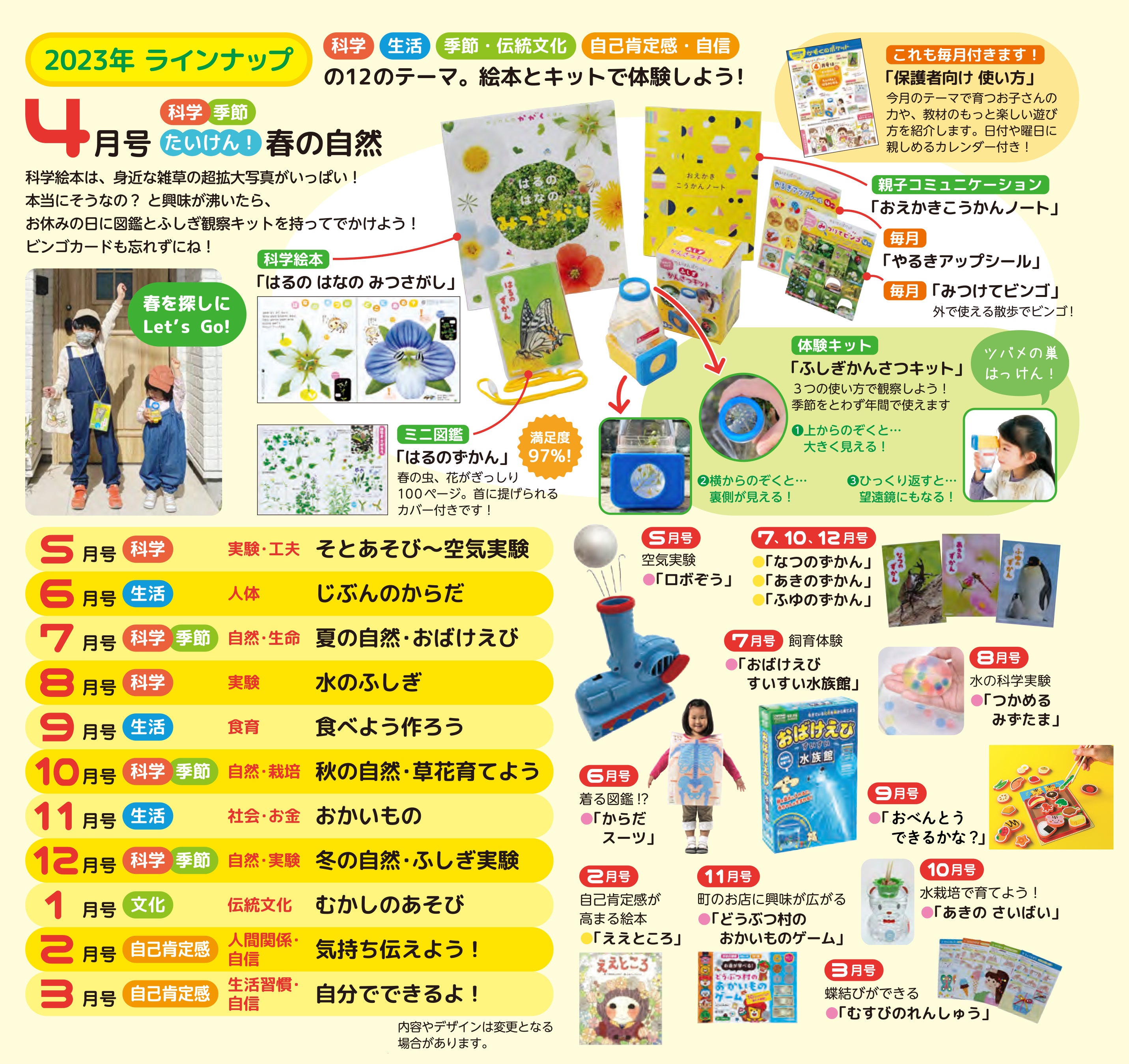 4月号では「はるのはなのみつさがし」「はるのずかん」「おえかきこうかんノート」「ふしぎかんさつキット」「みつけてビンゴ」「やるきアップシール」「図鑑専用フォルダー」「保護者サポート情報誌」など絵本や図鑑・たいけんキットを合計8点お届け!毎月、5・6歳の発達にぴったりな体験テーマがセットで届きます。