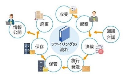 情報公開法における国民からの開示請求に関しては、迅速な対応、そして、公文書管理法では、適切な廃棄作業や歴史的価値のある公文書については公文書館への移管が求められています。公文書のライフサイクル、「収受・起案・決裁・施行」「情報公開」「ラベル管理」「所在管理」「引継ぎ(保存)・廃棄(延長)・移管管理」をひとつのパッケージで行えます。2024年10月現在、全国約100の自治体様、独立行政法人様等にご利用いただいております。