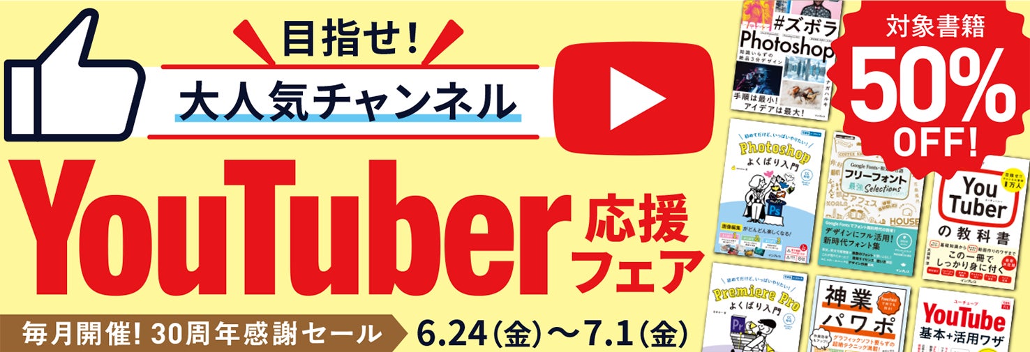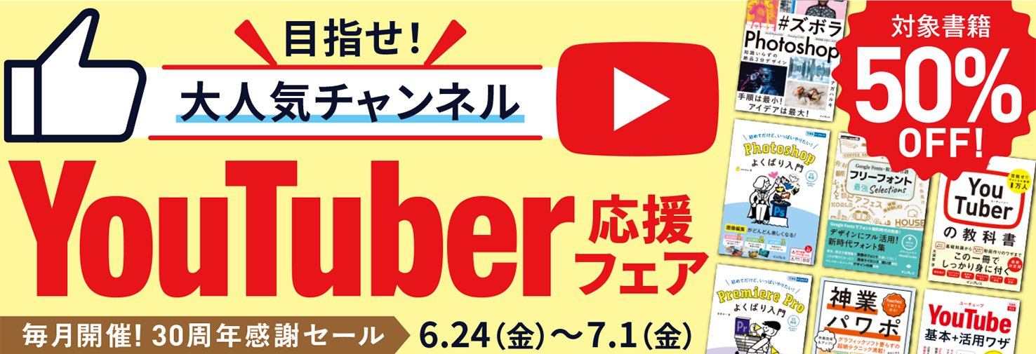 インプレスグループは1992年に結成され、2022年で創設30周年を迎えました。これまでのご愛顧に感謝の意を込めて、当社では「インプレスブックス」で販売している電子書籍を対象として50%オフで販売する「毎月開催! 30周年感謝セール」を実施いたします。第2弾となる6月のセールは「目指せ! 大人気チャンネル YouTuber応援フェア」です。