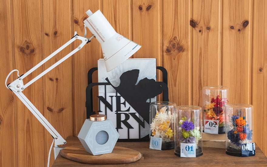 エヴァンゲリオンの世界観をイメージした「テーブルランプ」「マガジンラック」「卓上加湿器」と、各キャラクターをイメージした「フラワードーム」がラインナップ。
