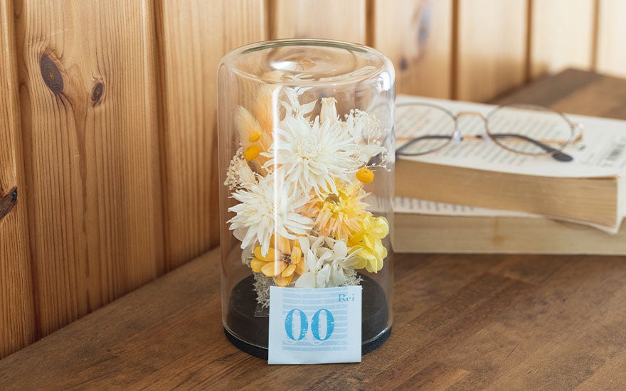 レイが搭乗するエヴァンゲリオン零号機の機体カラーを中心とした花材で、淡く儚げなアレンジに。