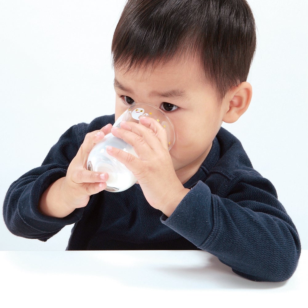 食育指導士でもある保育士さんの視点から開発されたグラスで、グラスの中程がくびれており、小さな手でも持ちやすい形状になっています。