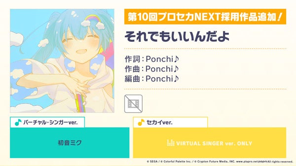 新たなリズムゲーム楽曲として、「それでもいいんだよ」(作詞・作曲:Ponchi♪)の追加が決定いたしました。本楽曲は、「一緒に作ろう!第10回楽曲コンテストプロセカNEXT」の採用曲です。