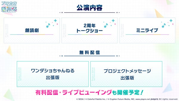 朗読劇、トークショー、ミニライブの三部構成になっております。また、「プロジェクトセカイワンダショちゃんねる 出張版 in 2nd Anniversary 感謝祭」などの無料生配信も予定しております。
