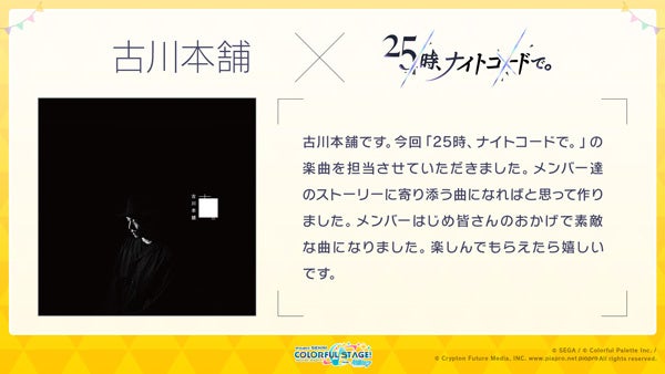 ナナホシ管弦楽団さんには「MORE MORE JUMP!」のユニット楽曲、古川本舗さんには「25時、ナイトコードで。」のユニット楽曲を提供いただきます。