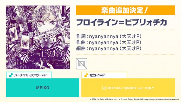 新たなリズムゲーム楽曲として、「フロイライン= ビブリォチカ」( 作詞・作曲:nyanyannya(大天才P))、「踊れオーケストラ」(作詞・作曲:YASUHIRO(康寛))、「ロストエンファウンド」(作詞・作曲:sasakure.UK)、「YY」(作詞・作曲:23.exe)の追加が決定いたしました。
