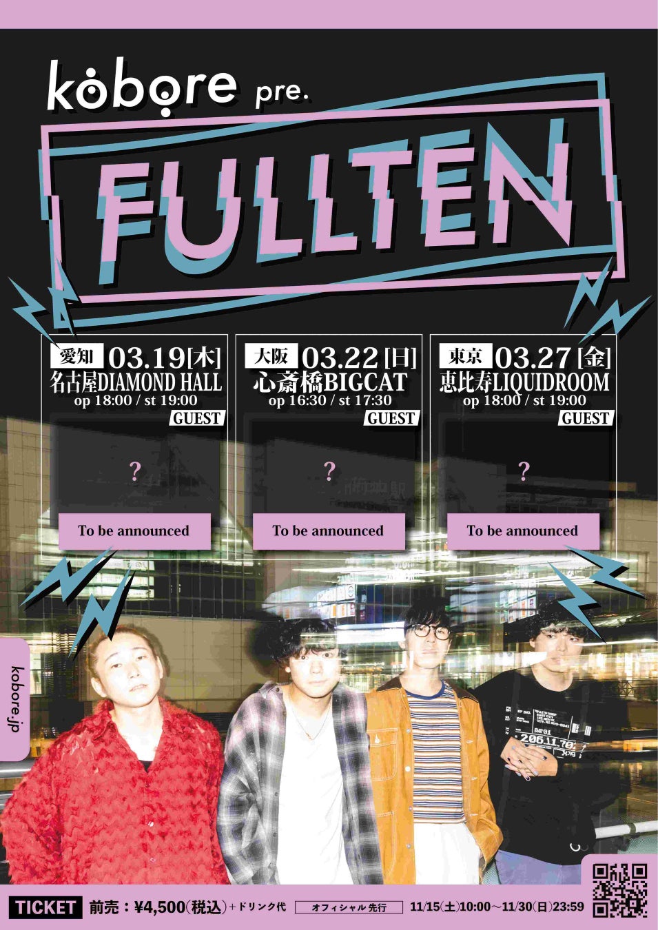 2026年3月に東京・名古屋・大阪の3都市で開催する対バン企画kobore pre.「FULLTEN」のオフィシャル先行が受付中なので奮って応募しよう。