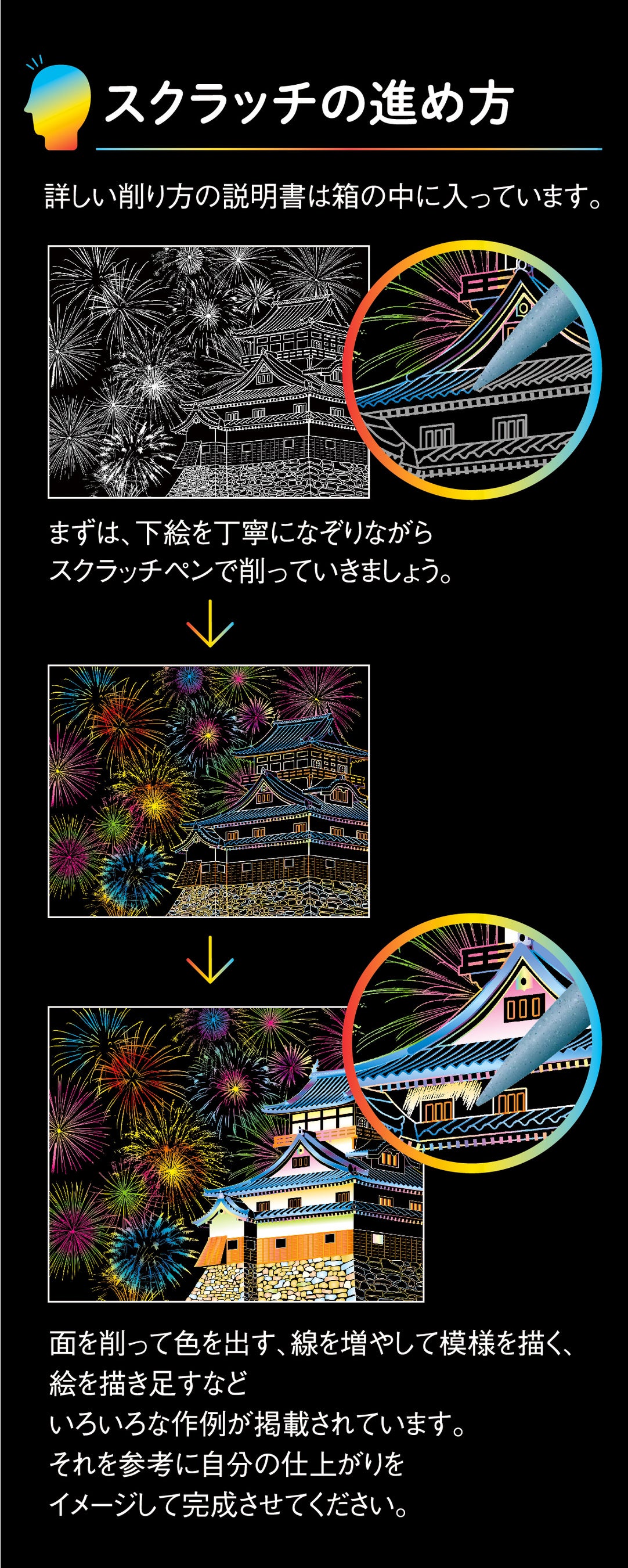 東北大学加齢医学研究所所長の川島隆太教授と共に開発した「脳活性スクラッチシリーズ」の特長は、なぞる下絵線が通常のスクラッチより少し太く見やすく作られていること、そして、簡単なものから力作まで、難易度が4段階に設計されていることです。仕上がりを自分なりにイメージし、削る場所を決めて削っていくことで、脳は活性化します。楽しくなければ脳は活性化しませんので、簡単なシートから誰でも気軽に進められ、楽しめることを目指しています。花火、灯籠流し、山車など日本の昔ながらの祭礼は、幼い頃の記憶から思い出をたどって楽しんでいただけるよう、心を込めて作りました。大切な方へのプレゼントにもおすすめします。