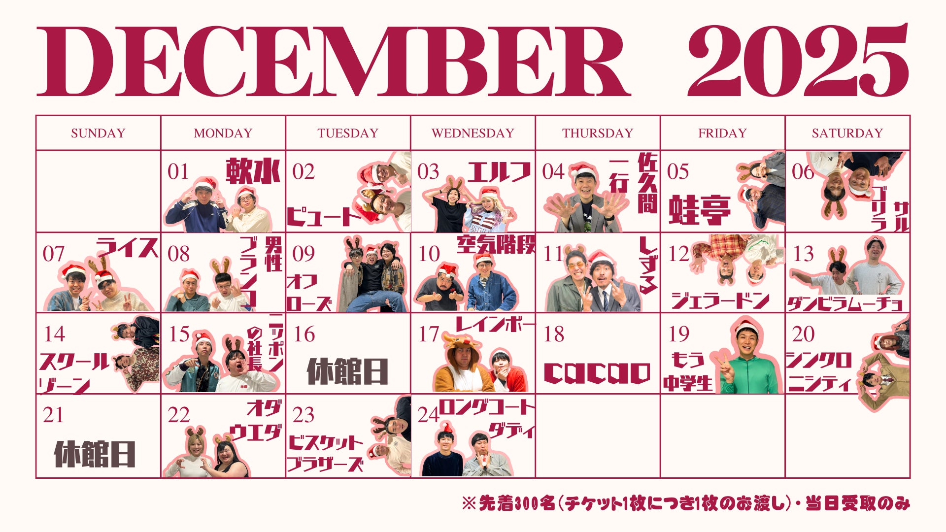 人気・実力のある22組のコント師による、直筆サイン入りのクリスマスカードを、各日先着300名様に数量限定でプレゼントします。カードの絵柄は日替わりとなりますので、詳細は劇場SNSの配布スケジュールをご確認ください。