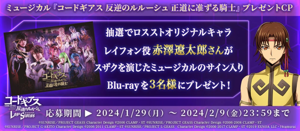 1月30日に開幕する2部7章に登場するロスストオリジナルキャラクター「チャオ・レイフォン(超雷峰)」のキャラクターボイスを俳優の赤澤遼太郎さんが演じることが決定しました。こちらを記念し、2023年に赤澤さんが枢木スザクを演じたミュージカル「コードギアス 反逆のルルーシュ 正道に准ずる騎士」(2024年3月末発売予定)のBlu-rayに赤澤さんのサインを入れて抽選で3名さまにプレゼント!是非ふるってご参加ください。