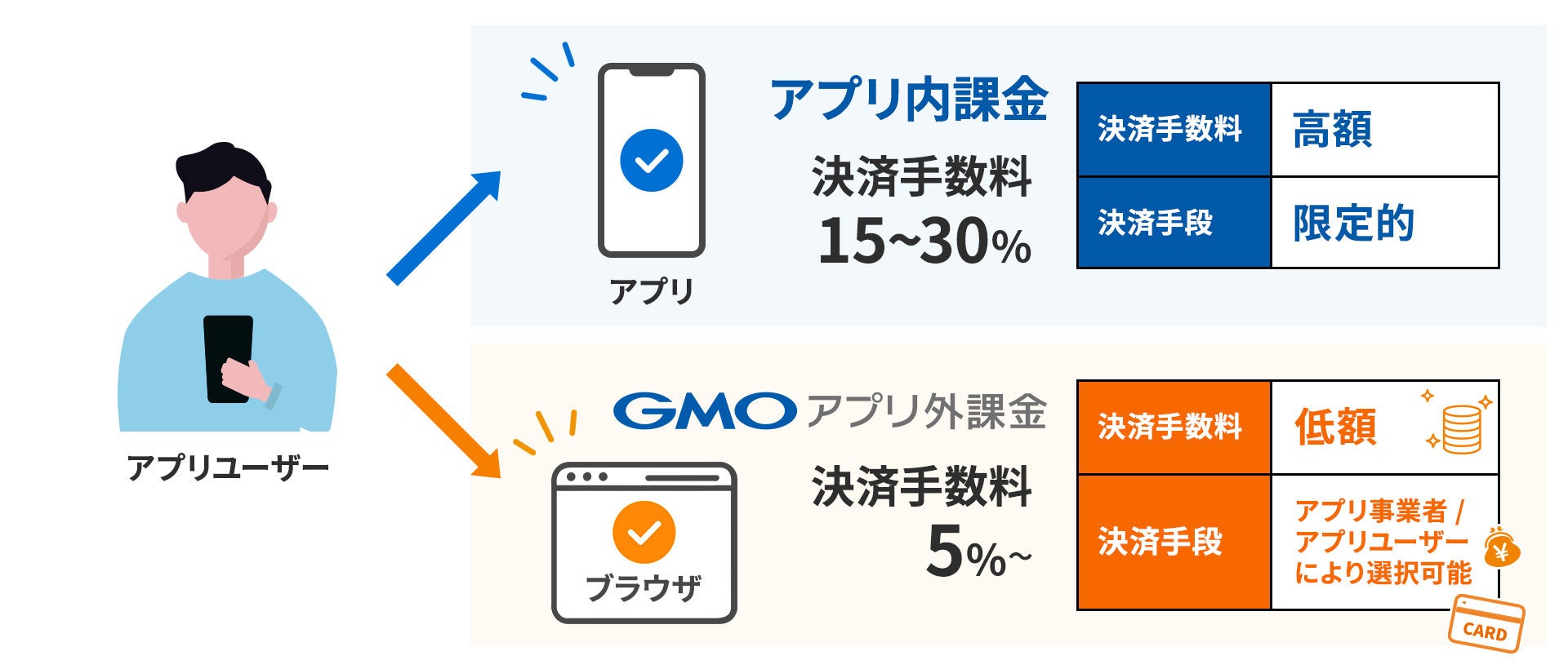 アプリ事業者向けに安価な決済機能を提供します。『GMOアプリ外課金』の決済手数料は、アプリストアを介した決済に比べて大幅に低減されます。