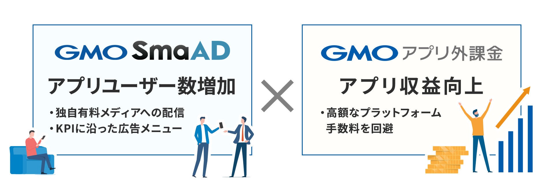 『GMO SmaAD』は、国内外3,000件以上の実績を持つスマートフォンアプリ向けアフィリエイト広告配信サービスであり、『GMOアプリ外課金』との連携で、アプリユーザーの獲得とアプリ収益の向上を同時に実現し、アプリ事業者のイノベーションを支援します。