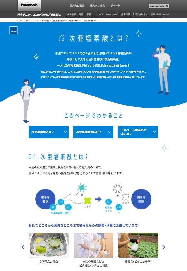 適切に用いれば安全・効果的な「次亜塩素酸」を正しく理解していただくため、次亜塩素酸の基礎知識、幅広い活躍例とともに、パナソニックが注目し研究を進めている領域とその理由をご紹介します。