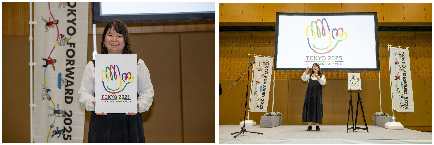 このデザインは、デフリンピックの特徴を、どのように表せるのかと考えた時に、すぐ、手の形を思いつきました。それをどんな風に表現するか、悩みに悩んで、やっと閃いて作ったものですので、それを皆さんに選んでいただけたことが嬉しいです。本当にありがとうございました。
