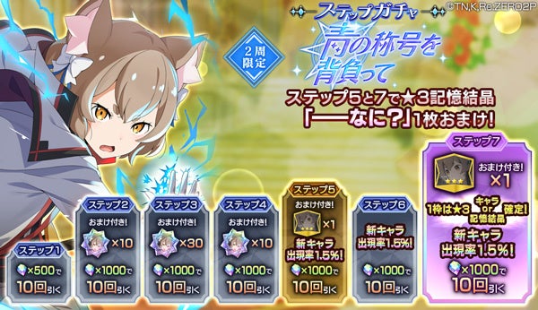 ステップ1では「魔法石500個」で10回ガチャを引くことができ、ステップ2・3・4では「【青の称号を背負って】フェリスのかけら」、ステップ5・6・7ではピックアップキャラの出現率が1.5%、ステップ5では記憶結晶「――なに?★3」のおまけ付き、ステップ7では10連中★3キャラもしくは★3記憶結晶が1枠確定&記憶結晶「――なに?★3」のおまけが付きます。