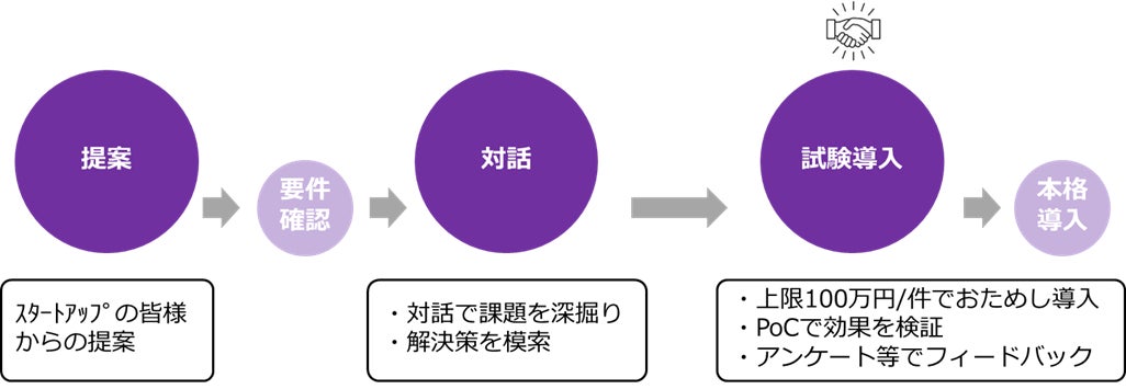 「スタートアップによる事業提案制度」は、社会課題の解決に取り組むスタートアップから、自らの技術・製品等を活用した都政に対する提案を募集した上で、各都政現場との対話により課題を深掘りし、試験導入等を通じて提案の具体化を図る仕組みです。