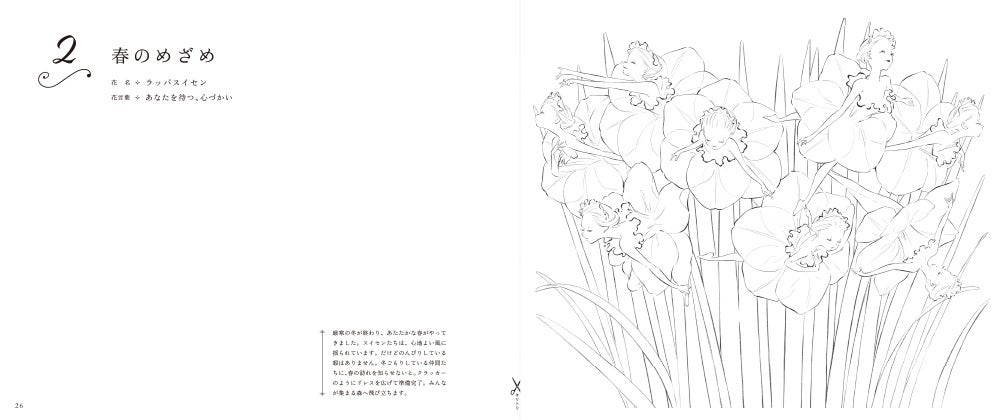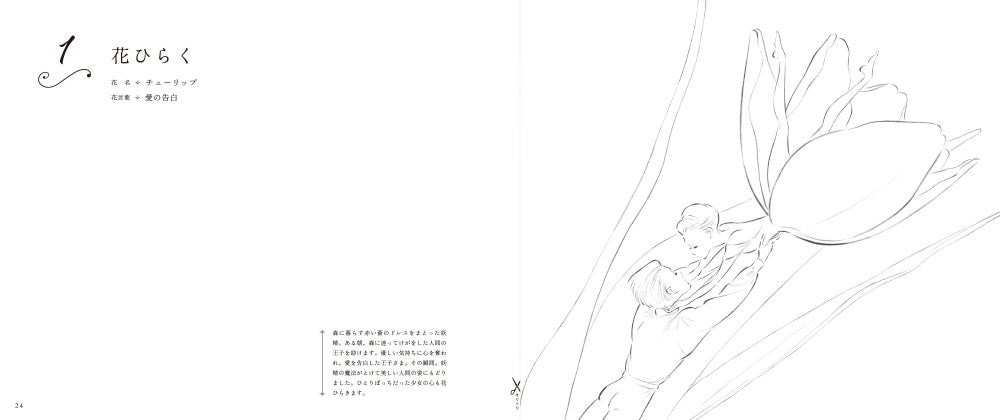 イラストには主役のほかに複数の花が登場しており、隠れた花ことばの意味を調べてみるとより深く物語(塗り絵)が楽しめることでしょう。