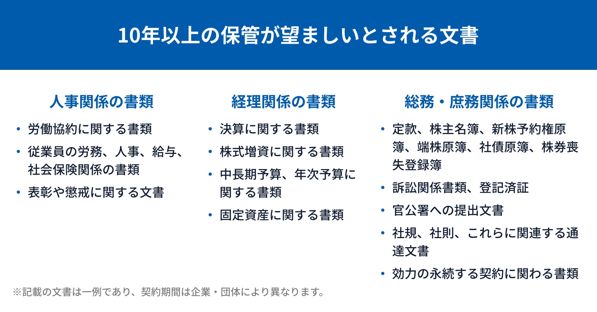 一方、依然として課題が残るのは「10年間を超える長期契約」や「効力が永続する契約(※5)」です。例えば、受け取った領収書の電子データ保管や、国から指定されている文書等は長期にわたり安全に保管する措置が必要です。また、法的に保管期間が定められていない文書や、法律で10年以下の保管期間で良いとされる場合でも、記載内容の重要性から一般的に永久保管が推奨される文書も存在します。それらは、上述した有効期間では対応し切れません。