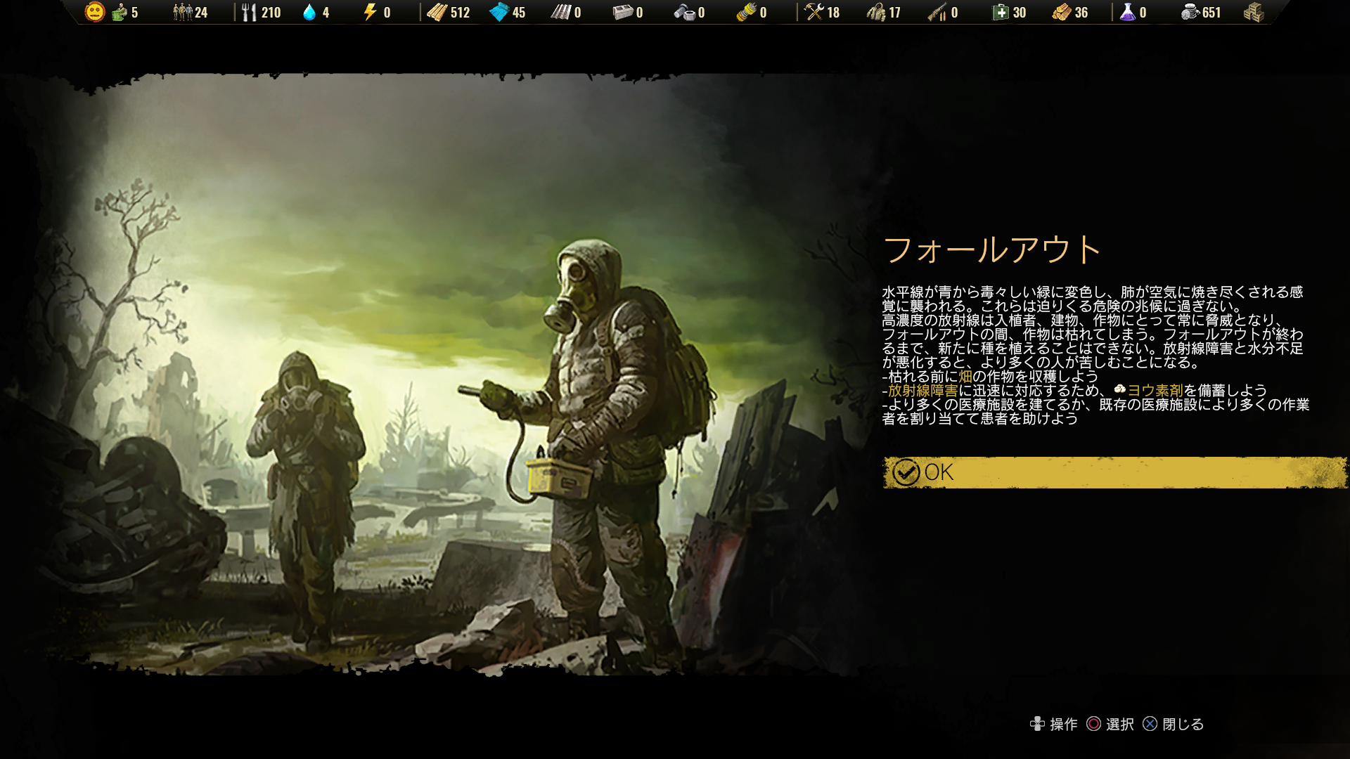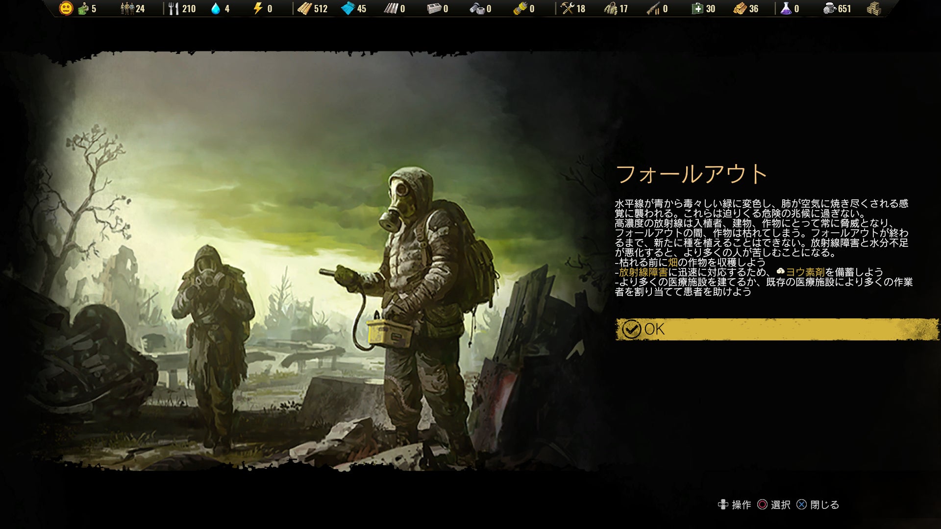 プレイヤーは、滅亡後の世界にコロニーを建設し、隕石やフォールアウトなどの回避不能な脅威をしのぐため、より強固な住居を作り、周囲を探索したりクエストを進めたりしながら、新技術の研究を進めていきます。