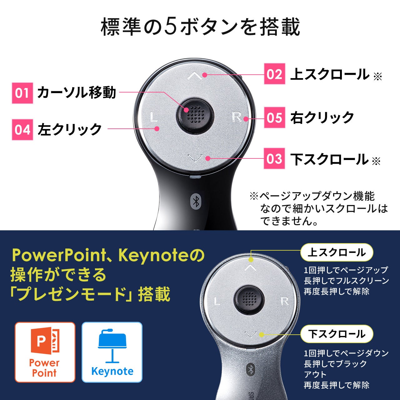 左右クリックなどの5ボタンを採用しています。会社でのプレゼンや家でリラックスした状態でも快適に使用できます。