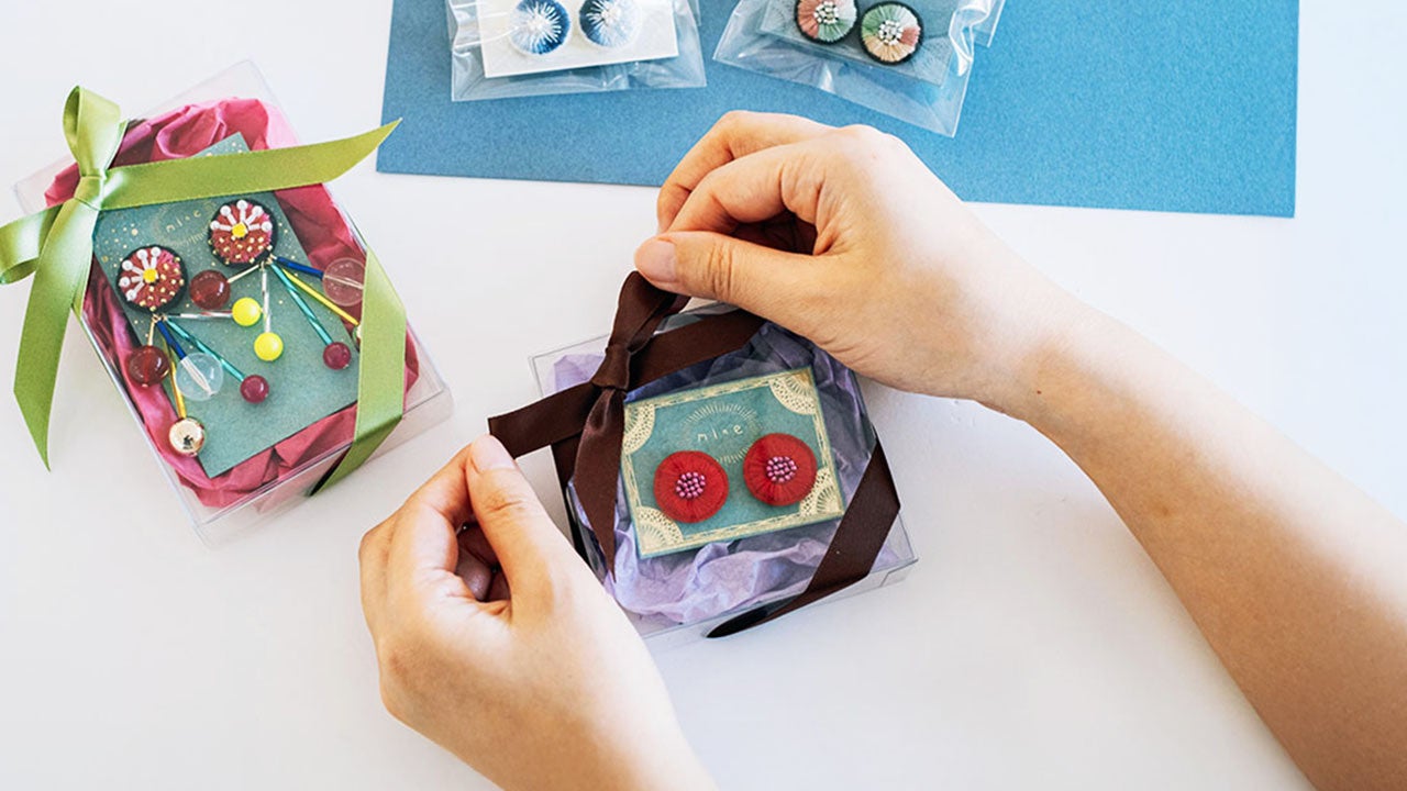 『minneのハンドメイドマーケット2024』では、ギフトシーズンに合わせて、購入した作品をその場で包装できる「セルフラッピングコーナー」を設置いたします。コーナー内には、さまざまなサイズやデザインの包装紙、リボン、メッセージタグなど、ギフトに最適なアイテムを豊富に取り揃え、特別な贈り物として仕上げることができます。