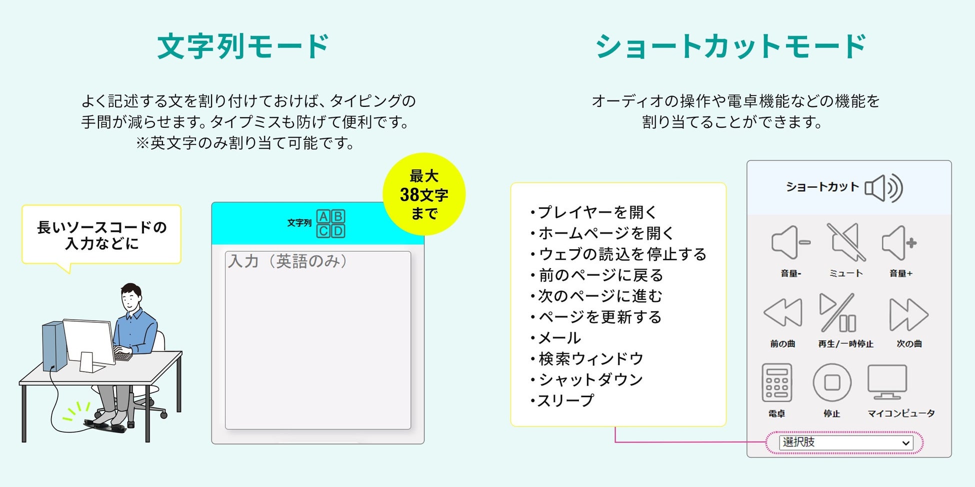 キーボードのショートカット(複数キー同時押し)や文字列を割り当て可能です。