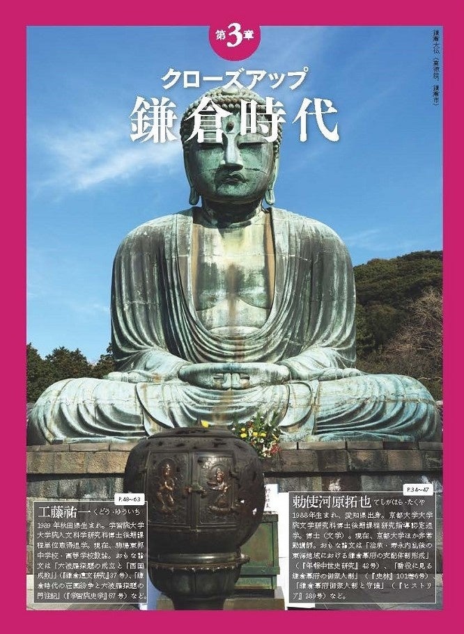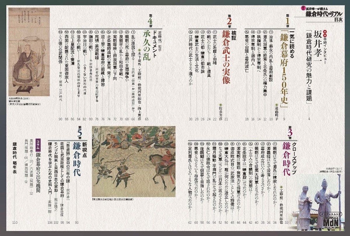 「一気に読める『鎌倉幕府150年史』」「検証 鎌倉武士の実像」「クローズアップ 鎌倉時代」「ドキュメント承久の乱」「新視点 鎌倉時代」の5章構成で展開し、研究者たちの最新常識を紹介。