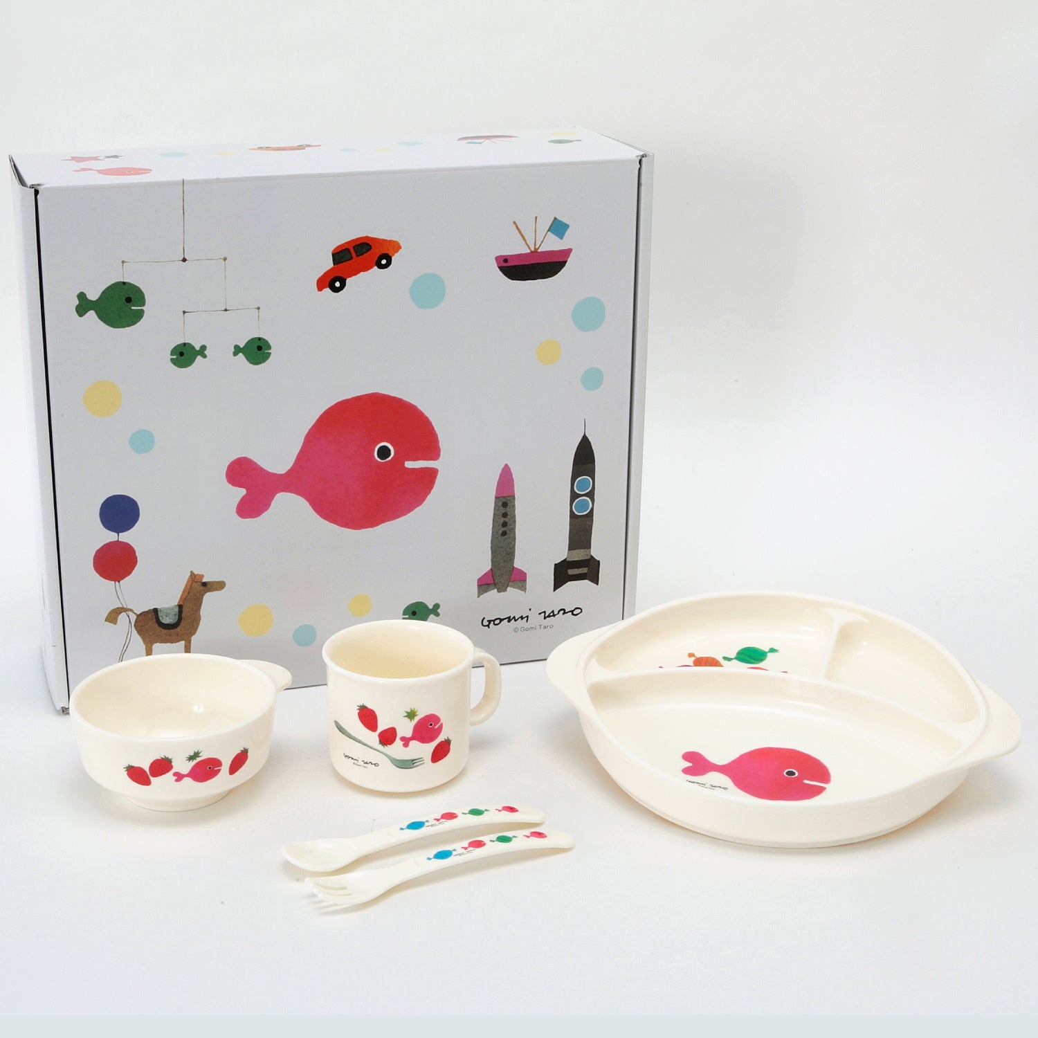 コップ・お茶碗・ランチプレート・スプーン&フォークセットの4つのアイテムがはいっており、離乳食の赤ちゃんから、自分で食べ始める幼児期まで長く使える一式がセットになっています。